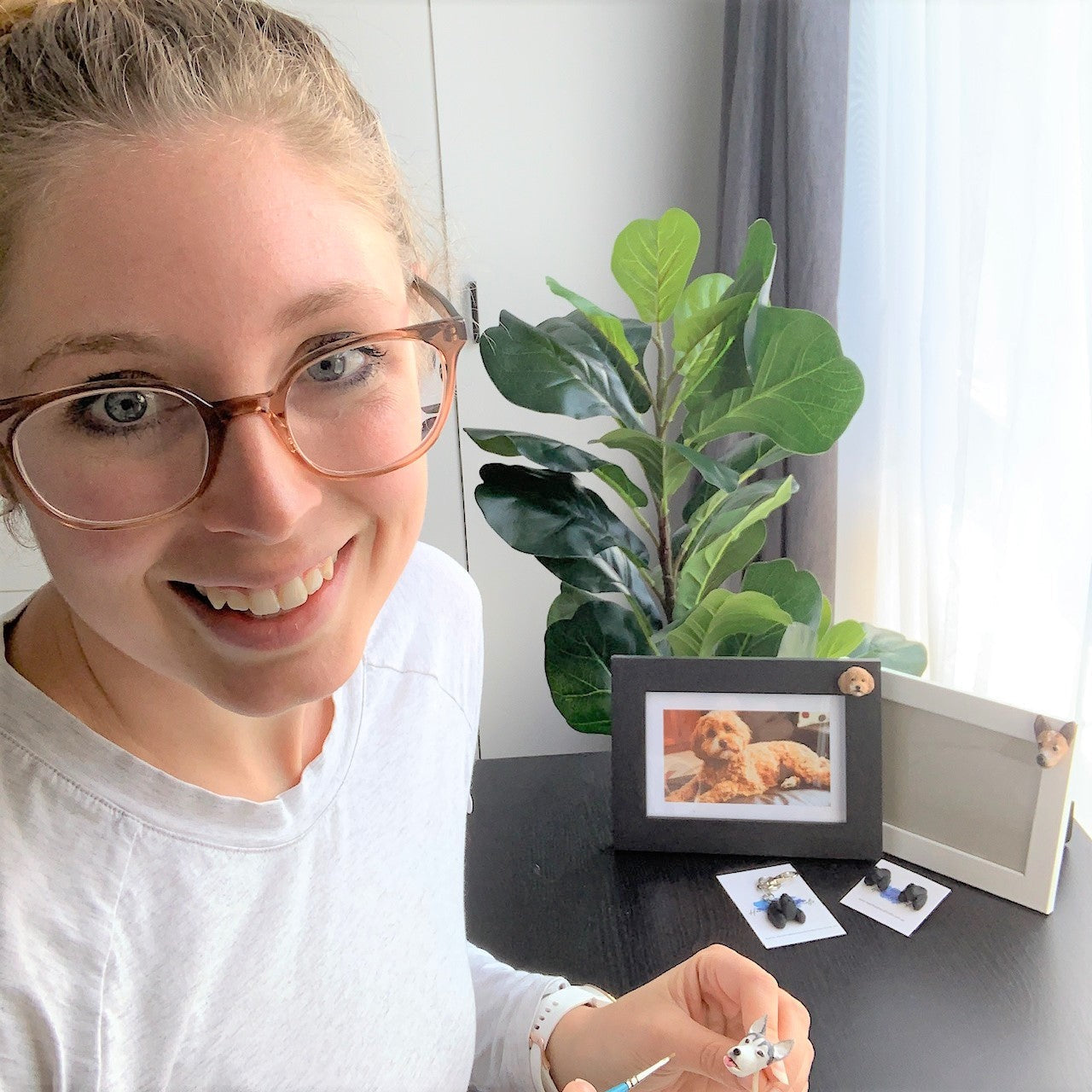 The dog face bead is handcrafted from polymer clay and framed perfectly with neutral raw timber beads either side. The details are added with acrylic paint before being sealed.
