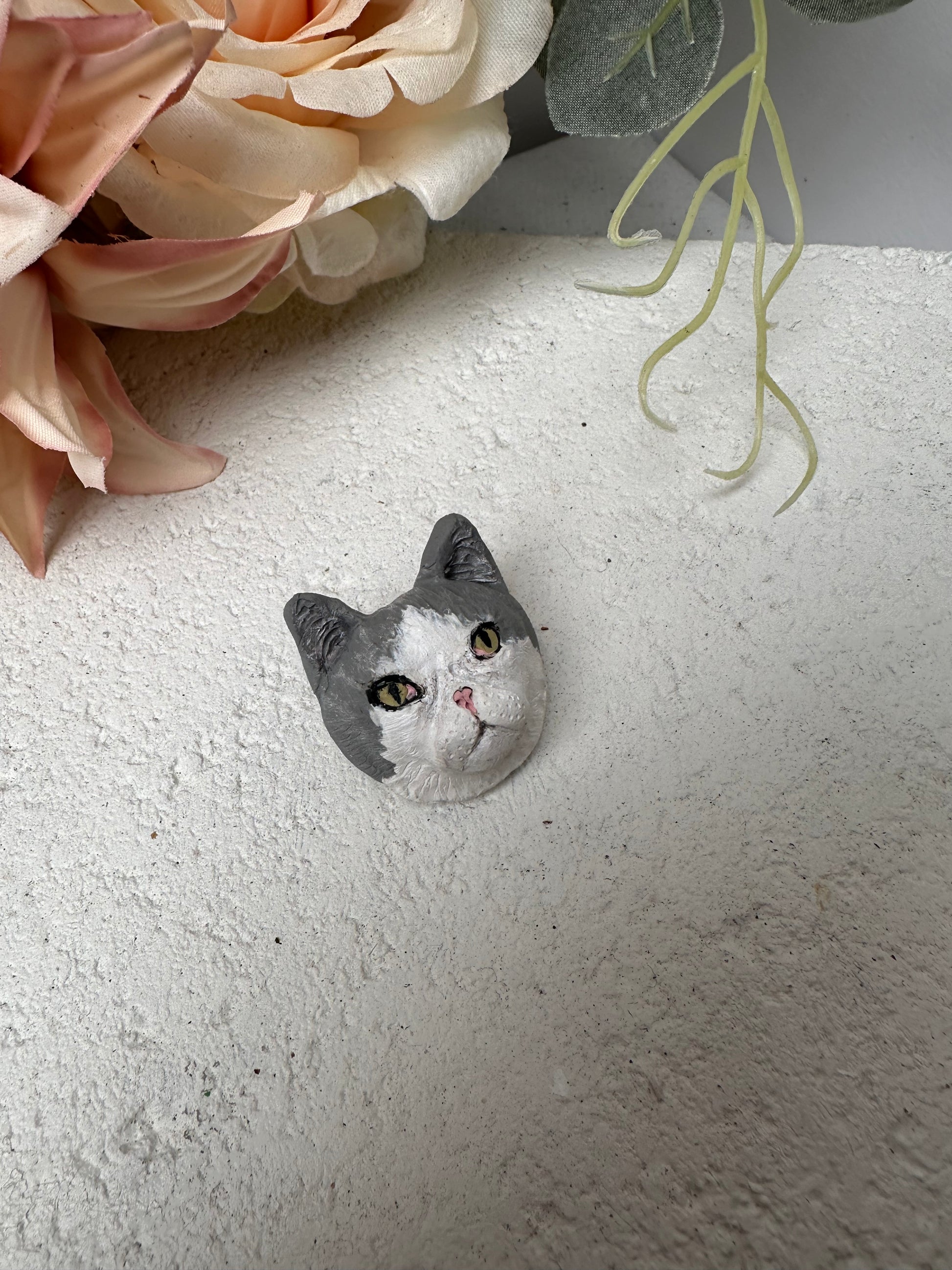 The pet faces are sculpted from polymer clay, baked to harden. Depending on colours, some pets will then have details added with acrylic paint, before it is sealed.