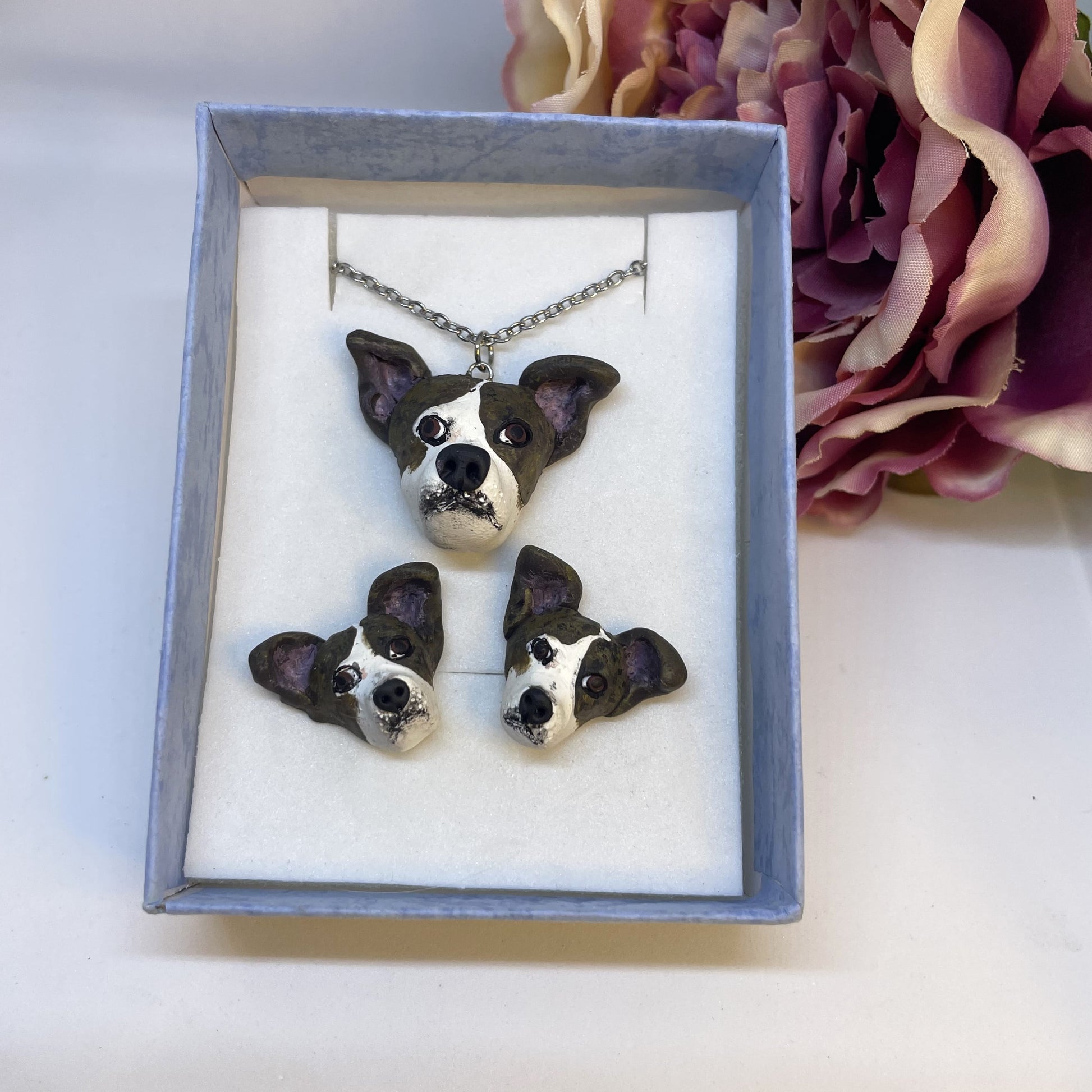 The pet faces are hand-sculpted into a pendant with an eyepin from polymer clay, then baked to harden. Depending on colours, some pets will also have details added with acrylic paint, before it is sealed.
