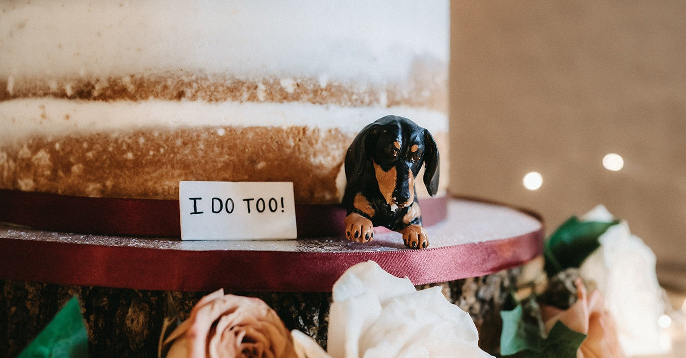 Custom pet peeking wedding cake toppers handcrafted by Dani to look just like pets as a sweet and affordable alternative to full body figurines.